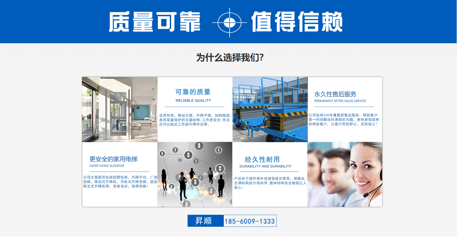 山東昇順液壓升降機械有限公司是一家主營家用電梯,別墅電梯,升降平臺,廠房貨梯,移動式升降機,導軌式升降貨梯,固定剪叉式升降機等產品企業,質量可靠,值得信賴。 用戶至上,以用戶為中心”是公司永遠堅持的服務宗旨,贏得用戶的贊許是我們的榮譽,及時滿足用戶的需求,是我們公司的愿望。長期以來,公司員工以優質的服務,取悅于用戶,以誠信的言行取信于用戶,得到了用戶們的好評。我們期待著與您更加愉快的合作!公司的發展,離不開社會的大力支持,在社會的支持和幫助下,我們正昂首闊步邁向未來! 我們的經營方針是:以質量求生存,以產品求發展,以信譽保合作,以服務贏客戶?! ”竟緦Ξa品質量和各項服務恪守合同承諾,并愿與新老客戶精誠合作,共創未來?! 」揪瘢簞撔率侵黝},超越是不懈的追求。 公司宗旨:信譽保證,誠信為本?! ∥覀儠院侠淼膬r格,良好的信譽,雄厚的實力,優質的產品,最周到的服務,服務于廣大新老客戶!...